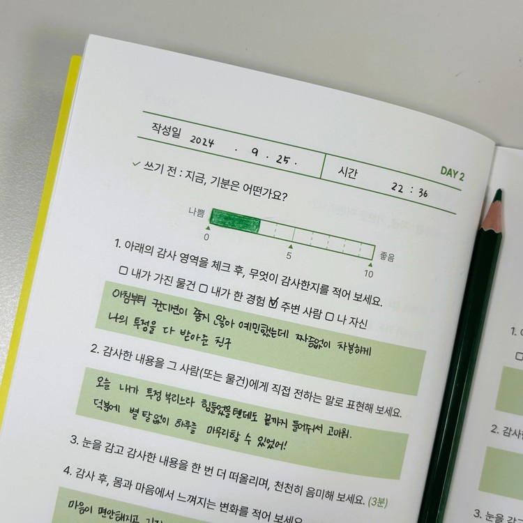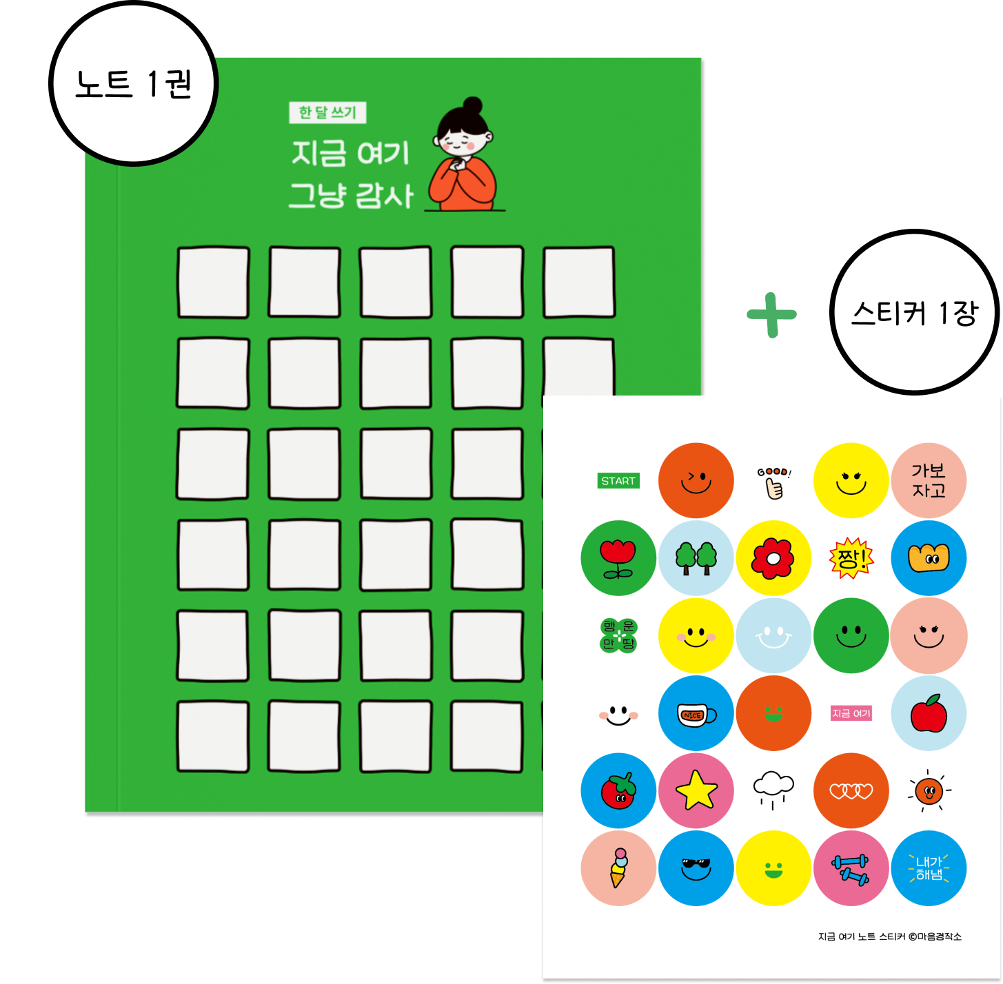 지금 여기, 그냥 감사 노트 1권과 기록 스티커 1장으로 구성되어 있어요 :)