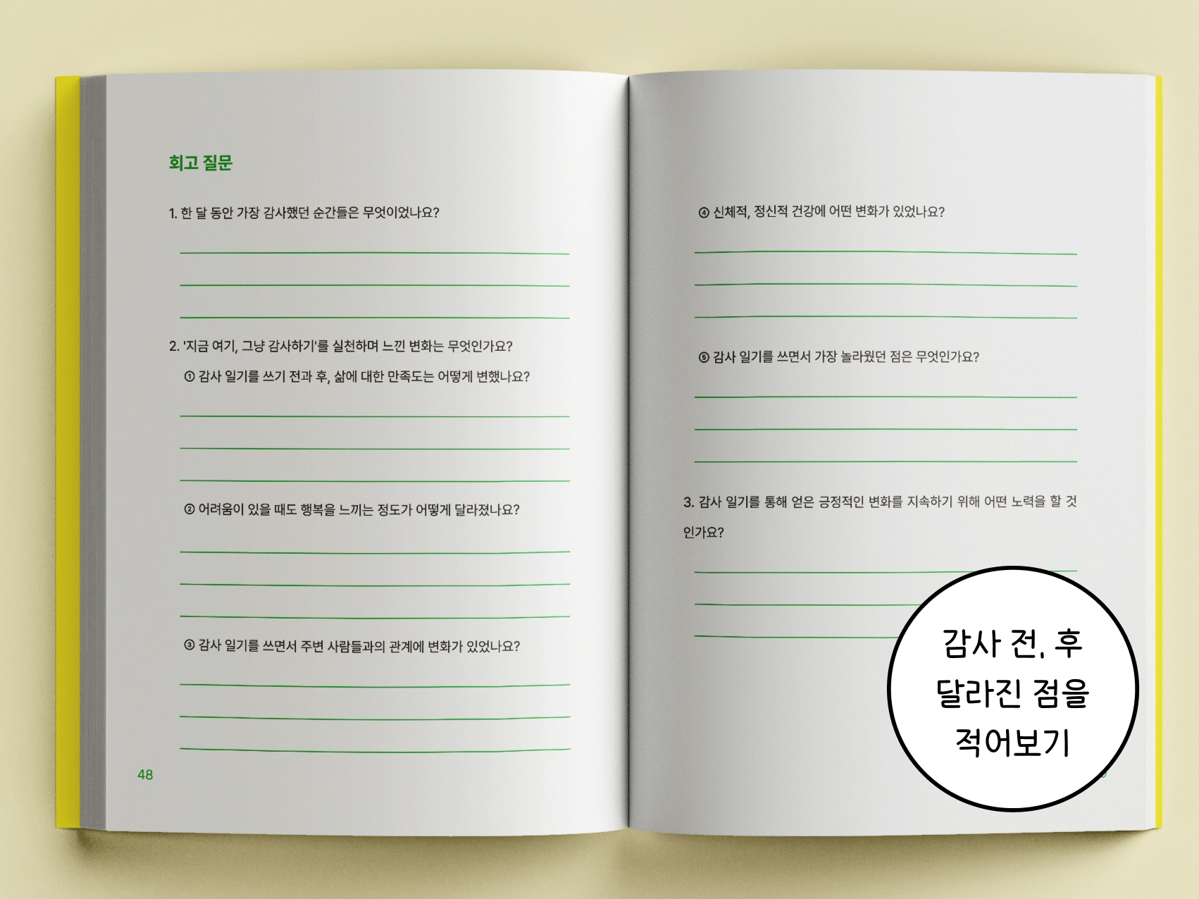 ④ 한 달간 감사 노트를 작성하고, 회고 질문으로 마무리해요!