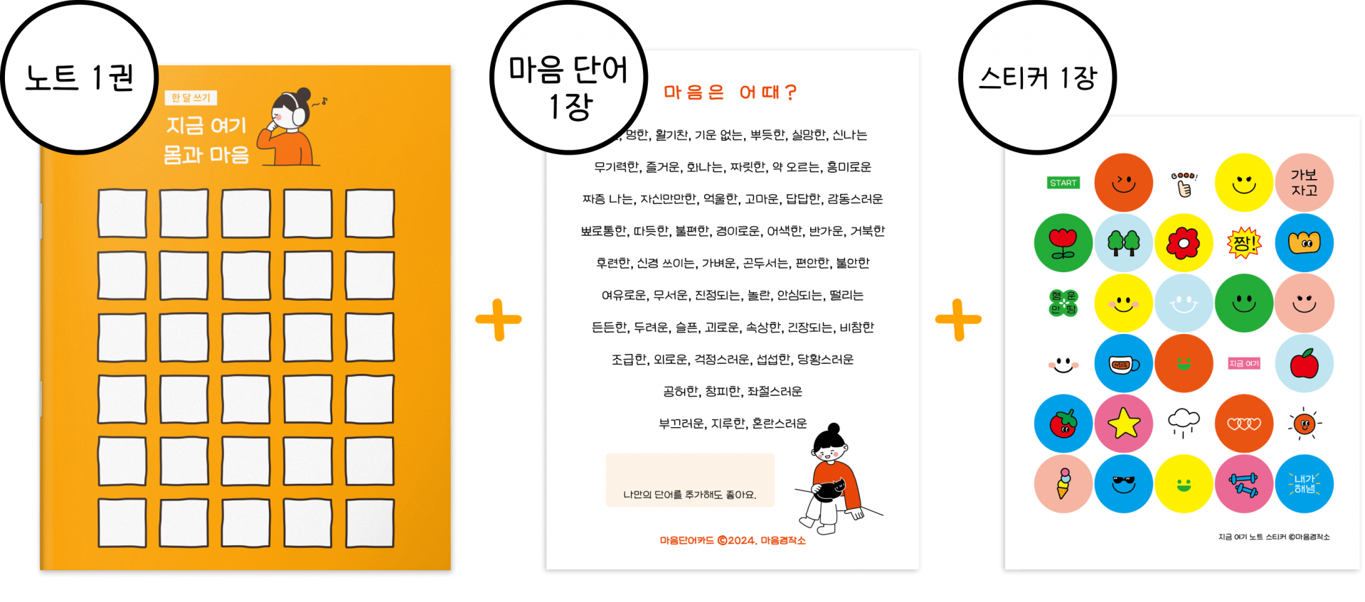 지금 여기, 몸과 마음 노트 1권과 마음단어 1장, 기록 스티커 1장으로 구성되어 있어요 :)