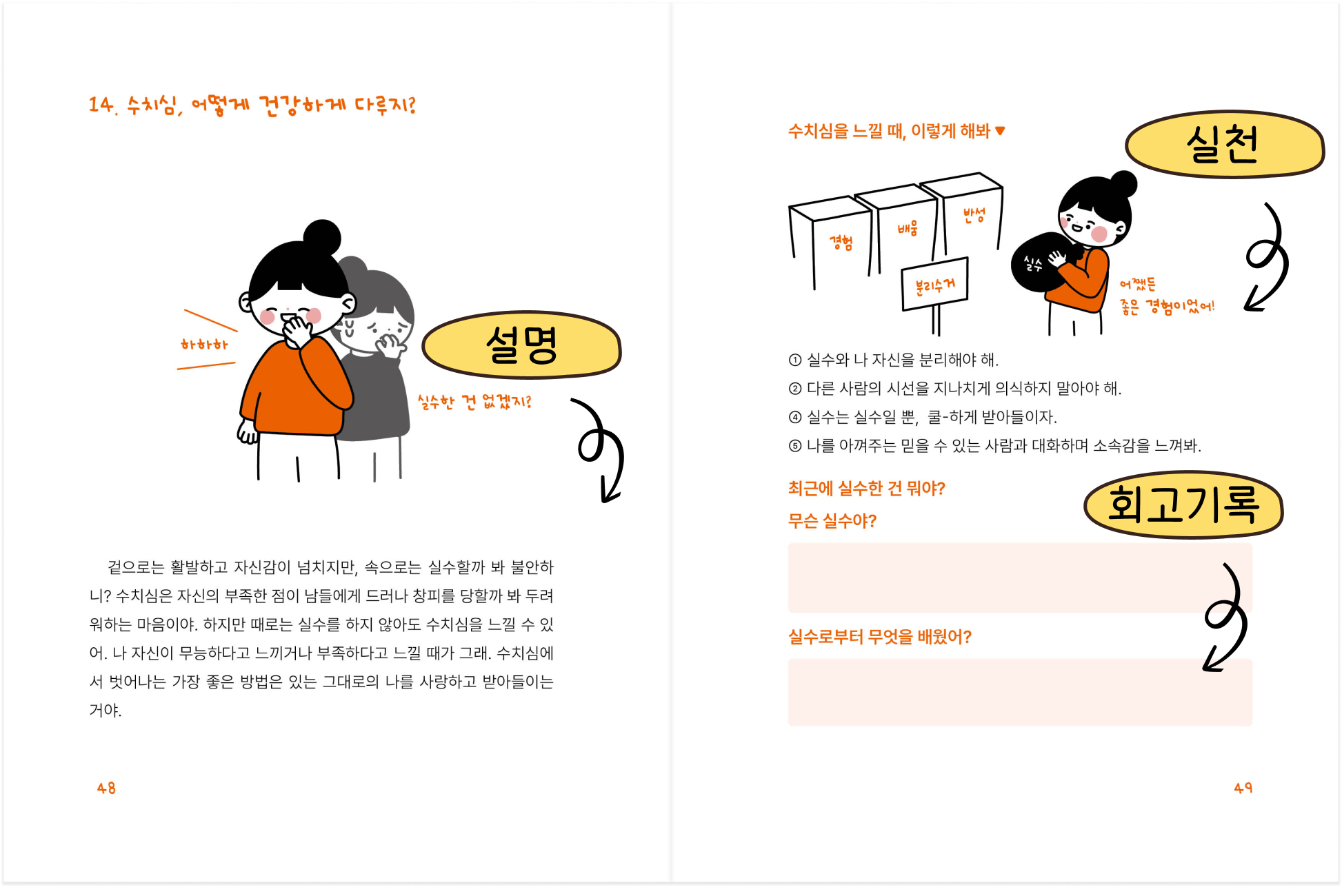 마음 돌봄 방법을 이해하기 쉽게 일러스트와 간단한 설명글로 제시한 후, 스스로 점검할 수 있게 체크리스트를 제공해요. 또한, 일상에서 마음 돌봄을 실천할 수 있도록 간단한 실천 방법도 함께 제시해요.
