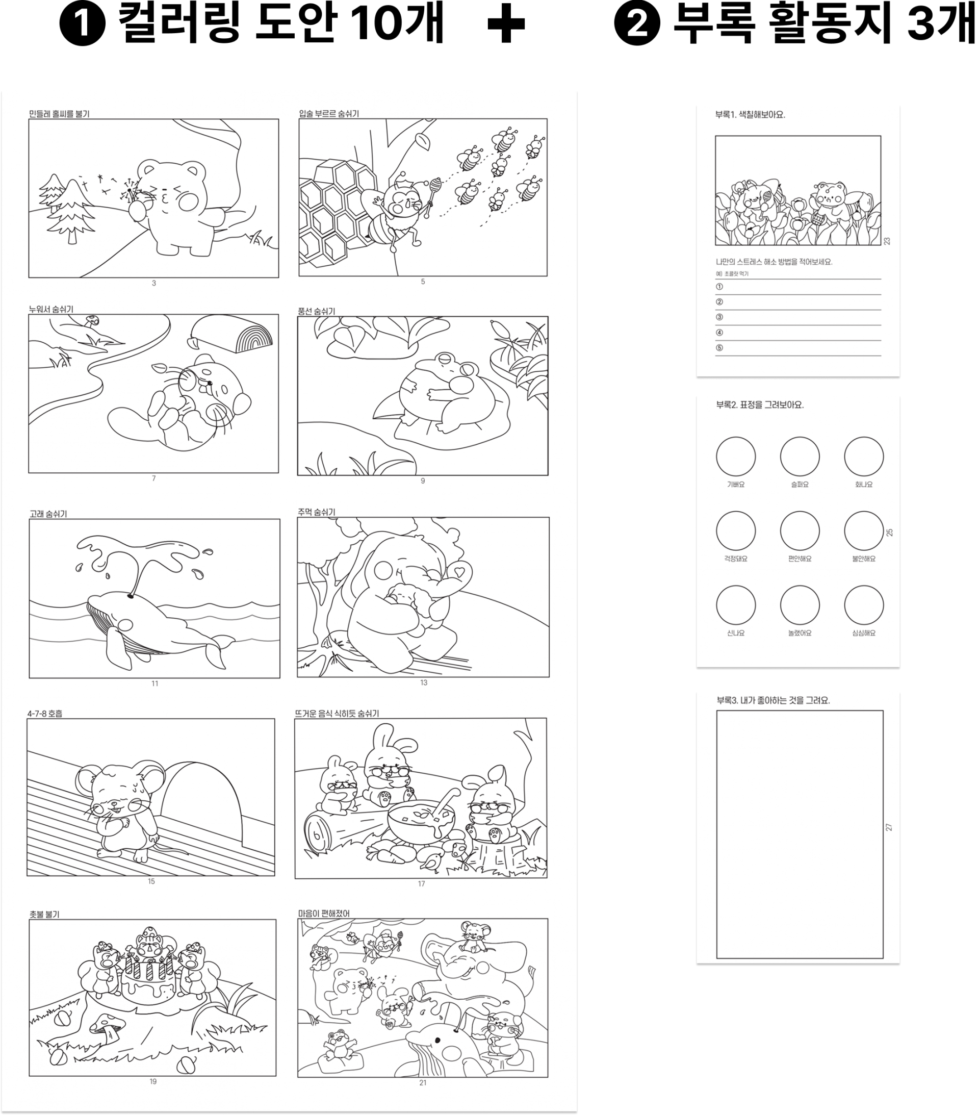 | 💡 활용 아이디어 ✅ 다양한 숨 쉬기 방법을 스토리로 만나보세요. ✅ 마음에 드는 도안을 선택하고 프린트하세요. ✅ 색칠하면서 호흡을 천천히 가다듬어요. ✅ 완성된 컬러링을 보며 숨 쉬는 연습을 해보세요. |