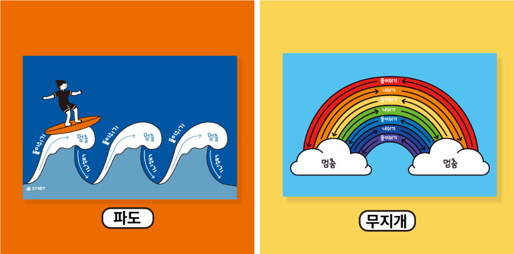 멈춤에서 숨을 잠시 참았다가 다시 따라해요. 엽서 한 장 속 숨쉬기를 따라하다보면 어느새 마음이 가라앉는 것을 느낄 수 있답니다.
